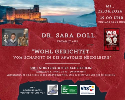 Diese Frage richteten die Scharfrichter so oder ähnlich an die vorsitzenden Gerichtspersonen, um die Legitimation einer zuvor vollzogenen Hinrichtung zu erhalten. In der Rhein-Neckar-Region wurden tatsächlich etliche Todesstrafen, die im 19. Jahrhundert öffentlich und später dem Blick entzogen, hinter den Mauern von Gefängnissen, vollzogen. Wer waren die Menschen, denen der Prozess gemacht wurden? Einige dieser Schicksale möchte Sara Doll exemplarisch vorstellen. Dabei sollen nicht nur die historischen Kriminalfälle eine Rolle spielen, es werden auch weitere Vorgänge in der Anatomie, die „Verwendung“ der Verstorbenen im Wissenschaftsbetrieb erklärt.